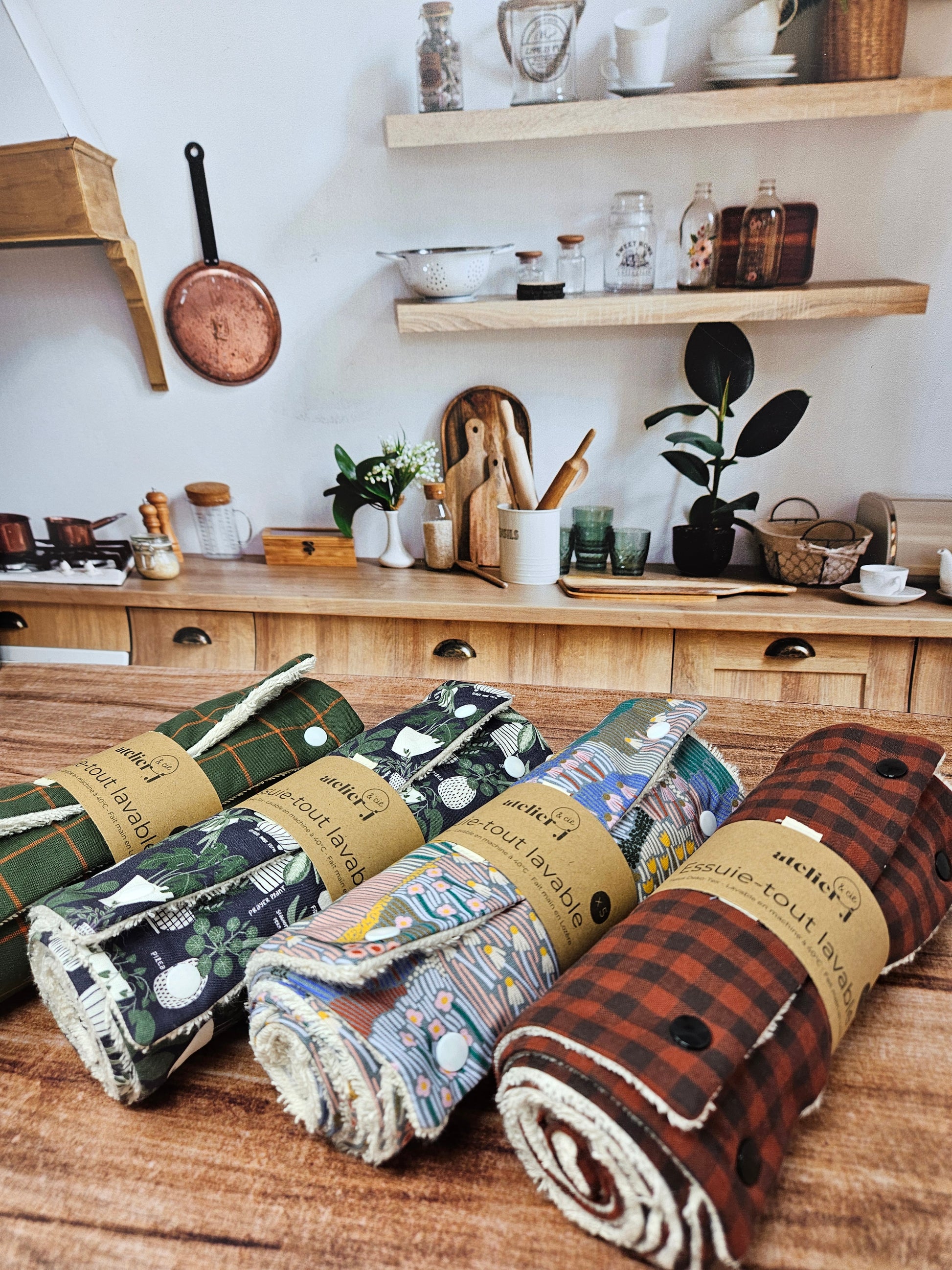 Rouleau de 5 feuilles essuie tout lavables fait main avec des tissus et éponges certifiés Oeko Tex.